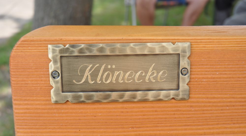 Herzlich willkommen: Ein Schild mit dem Schriftzug "Klönecke" ziert eine der zwei Bänke.